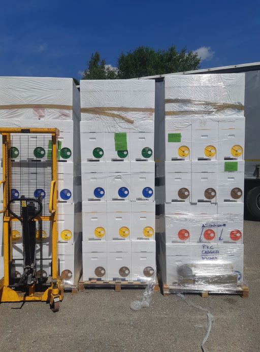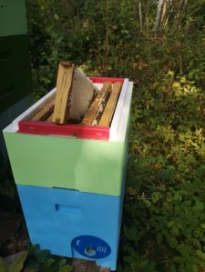 2019.gada jūnija sākumā veidotie atdaleņi (3 peru kāres) ar neapsēklotu māti, P_HIVE stropos sanesa pilnu medustelpu ar viršu medu. Fotogrāfija uzņemta 24.08.2019